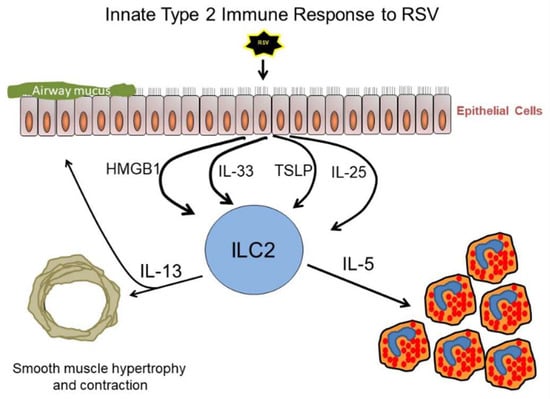 Our understanding of the role the innate immune system and associated epithelial-derived cytokines in the induction of type 2 programming in response to RSV infection has dramatically increased over the past decade, mainly due to the discovery of ILC2. The data discussed in this review strongly implicate ILC2, IL-33, TSLP, HMGB1, and IL-25 as key early mediators of the type 2 response to RSV. Albeit with some discrepancies, some studies strongly implicate IL-33 [] as the driver of the type 2 response, while others implicate TSLP [], HMGB1 [], and IL-25 []. It is possible that strain differences in RSV or differences in age elicit differences in the production of early mediators that then drive the type 2 response. Nevertheless, we still have a long way to go to accurately understand how and why this response is induced in response to RSV infection and its association to severe RSV-induced bronchiolitis with the possible relationship to the later development of childhood asthma. It is important to also consider that children who develop severe RSV-mediated bronchiolitis and childhood asthma may already have baseline alterations in the levels of type 2 cytokines and numbers of cells that mediate type 2 responses prior to infection. If this is in fact the case, then infants that are predisposed to asthma, because of genetic or other risk factors, might be more likely to develop severe RSV infections. The conundrum of whether a predisposition for allergic disease and asthma is a risk factor for severe RSV bronchiolitis, or whether severe RSV bronchiolitis is a risk factor for subsequent asthma and allergic disease, is still being investigated. Regardless of the root cause of severe RSV-mediated bronchiolitis, such as host, virus, and/or environmental factors, it is worth to consider investigating emerging therapies directed at type 2 and epithelial-derived cytokine signaling that have recently been approved, or are in the pipeline for approval, for asthma treatment as therapies through clinical trials. The potential benefit for using agents, such as dupilumab and tezepelumab, as treatments for these patients would be two-fold; it would provide concrete evidence of the contribution of innate type 2 inflammation to disease pathogenesis and might also provide a novel therapeutic target. It is also possible that use of therapies to treat RSV-mediated bronchiolitis that target the early acting alarmins like IL-33 may have no effect as they often will not be administered until after the peak response from these cytokines has been initiated. Yet the amount of evidence related to involvement of IL-33 in the pathogenesis of RSV-mediated bronchiolitis justifies the evaluation of those therapies. For instance, in the mouse model of RSV infection, anti-TSLP antibodies administered either 6 or 36 hours after infection resulted in a significant decrease in IL-13-expressing ILC2 []. This result suggests that treating patients after infection with biologics targeting cytokines that stimulate ILC2 may represent a successful strategy. Immune modulation is tricky, given the extensive interplay and interdependency on the part of the immune which occurs during the clearance of infection, or really in response to any illness or disease. However, testing these antibody therapies rigorously in randomized, double-blind, placebo-controlled clinical trials may be something to consider, as they may prove to be new therapies for patients that are highly susceptible to severe infection who stand the greatest risk of sustaining lifelong respiratory complications from RSV.