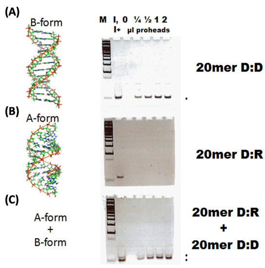 Nuclease assay showing packaging of (A) 20mer D:D, (B) 20mer D:R, and (C) 20mer D:R together with 20mer D:D substrates. Addition of a 20mer dsDNA helper (D:D) packaging substrate allows efficient packaging of a 20mer DNA:RNA heteroduplex (D:R), whereas the D:R alone is inefficient packaging. The D and R oligonucleotide complementary sequences are the same. Structures of B-form DNA (helix rise per base pair is ~3.4 Å) and A-form DNA (helix rise per base pair is ~2.6 Å) are shown. dsRNA and D:R heteroduplex structures are known to be A–form. M is Mol Wt marker lane, I is input packaging substrate, with µl of proheads added to the in vitro packaging mix shown above the indicated lanes. Following nuclease digestion as described under Materials and Methods, the amount of packaging-protected ds oligonucleotide stained with EthBr is shown for each substrate or substrate mixture as indicated by the dots (.).