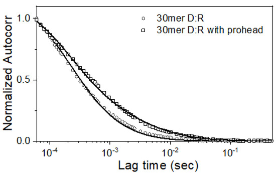 Autocorrelation plots of fluorescently labeled 30 mer D:R construct in the presence and absence of prohead. Experimental data are shown as points, and curves fitted with a one (30mer D:R) or two (30 mer D:R plus prohead) species diffusion model are superimposed as lines.