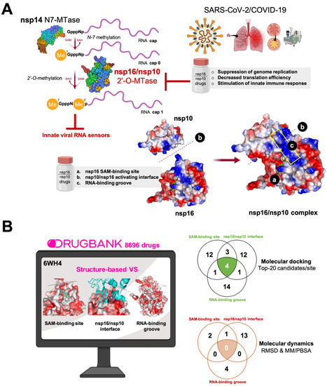 Here, we used a virtual screening approach of molecular docking of ≈9000 U.S. Food and Drug Administration (FDA)-approved investigational and experimental (discovery-phase) drugs to identify potential candidates that can be directed to the RNA cap 2′-O-MTase nsp16/nsp10 complex (Figure 1B). To provide a better prediction of the binding modes of the selected drugs to the nsp16/nsp10 protein complex and to explore the stability of the nsp16/nsp10–drug complexes, we performed 100 ns molecular dynamics (MD) simulations and monitored the convergence of the root mean square deviation (RMSD) plots of the nsp16/nsp10 protein complex backbone and the non-hydrogen atoms of the drugs. To further explore the stability of the binding modes of the predicted candidates to the nsp16/nsp10 protein complex, MD simulations were employed for free energy calculations using molecular mechanics Poisson–Boltzmann surface area (MM/PBSA) approximation approaches. Finally, we searched the literature to consider the pharmacological overlapping of the selected, high-scoring nsp16/nsp10-targeting drugs with key functional modules of the virus–host interactome that are relevant for the viral lifecycle, as well as with clinical and laboratory features of COVID-19.