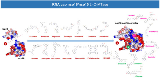 Predicted potential inhibitors of the nsp16/nsp10 2′-O-MTAse complex. Structures of the potential drugs were predicted to target: (a) the (nsp10-stabilized) S-adenosyl-l-methionine (SAM)-binding pocket of nsp16 (green code), (b) the unique “activating surface” between nsp16 and nsp10 (brown code), and (c) the (nsp10-extended) RNA-binding groove of nsp16 (pink code).