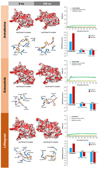 Incorporation models of the predicted nsp16-activating-surface-targeting drugs in SARS-CoV-2 2′-O-MTAse. The best poses of the predicted candidates coupled to the nsp16 activating surface before (0 ns) and after (100 ns) the molecular dynamics (MD) simulation are shown. The protein has been represented as a function of the hydrophobicity of its surface amino acids and the Na+ and Cl− ions have been eliminated to facilitate visualization. Each inset shows the detailed interactions of each drug candidate docked to the nsp16 activating surface, indicating the participating amino acids involved in the interaction and the type of interaction (hydrogen bonds, hydrophilic interactions, salt bridges, Π-stacking, etc). The root mean square deviation (RMSD, Å) of each drug’s heavy atoms over the simulation time, measured after superposing the protein on its reference structure, is shown. In the context of the MD presented here, the RMSD incorporates traces of SAM alone and in two additional control simulations (i.e., nsp16/nsp10 complex and nsp16 alone).