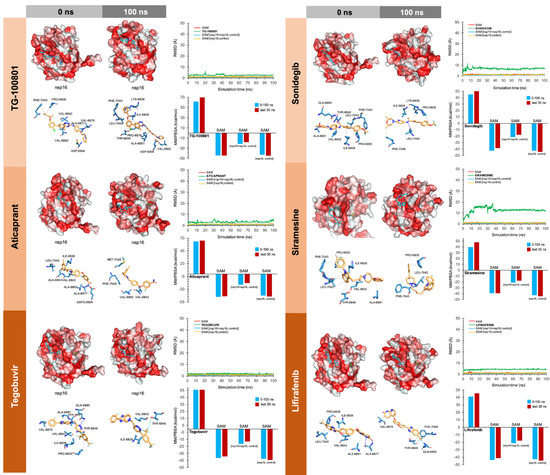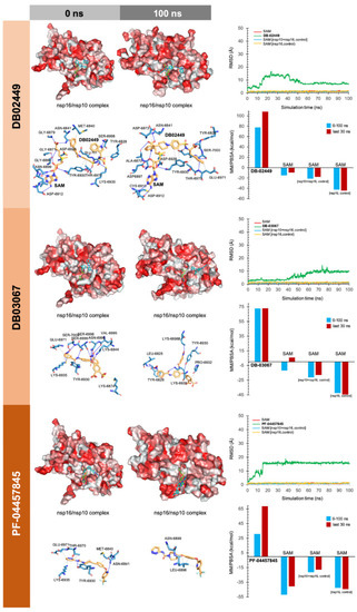 Incorporation models of the predicted SAM-binding-site-targeting drugs in SARS-CoV-2 2′-O-MTAse. The best poses of the predicted candidates coupled to the SAM-binding site of the nsp16/nsp10 complex before (0 ns) and after (100 ns) the molecular dynamics (MD) simulation are shown. The protein is represented as a function of the hydrophobicity of its surface amino acids and the Na+ and Cl− ions have been eliminated to facilitate visualization. Each inset shows the detailed interactions of each drug candidate docked to the SAM-binding site of nsp16, indicating the participating amino acids involved in the interaction and the type of interaction (hydrogen bonds, hydrophilic interactions, salt bridges, Π-stacking, etc). The root mean square deviation (RMSD, Å) of each drug’s heavy atoms over the simulation time, measured after superposing the protein on its reference structure, is shown. In the context of the MD presented here, the RMSD incorporates traces of SAM in two independent control simulations (i.e., nsp16/nsp10 complex and nsp16 alone).