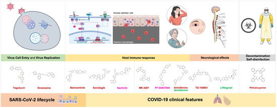 Bemcentinib (BGB324/R-428), a first-in-class highly selective oral AXL tyrosine kinase inhibitor in phase II development, was also predicted to stably occupy the nsp16/nsp10 activating interface. Although mainly recognized for its ability to block epithelial–mesenchymal transition phenomena in various cancer types [93,94,95], bemcentinib is now known for its anti-inflammatory and anti-fibrotic roles in non-cancer diseases [96,97], which are two phenotypic aspects that might be relevant in the therapeutic management of COVID-19. Moreover, AXL is a family member of the TAM receptor tyrosine kinases that operates both as a pleiotropic inhibitor of the innate immune response and a docking site during the cellular entry of some viruses [98,99,100]. As AXL receptor signaling participates in the downmodulation of interferon-related host immune responses to promote viral infection, inhibiting AXL function might be a new therapeutic avenue toward reducing the transmission of some of the most troublesome emerging enveloped viruses, including dengue, West Nile, Ebola, lentivirus, and most recently, Zika [99,100]. If experimentally confirmed as a blocker of the nsp16/nsp10-driven viral innate immunoevasion via suppression of viral RNA 2′-O-methylation, bemcentinib might also stimulate an advantageous increase in the early expression of interferon-stimulated genes that are capable of promoting a greater attenuation of SARS-CoV-2 replication. Bemcentinib was recently shown to block lysosomal acidification and promote the accumulation of autophagosomes in cancer cells independently of its inhibitory effects on AXL [101,102], thereby suggesting an additional overlapping mechanism with the above-mentioned lysosomotropic agents.