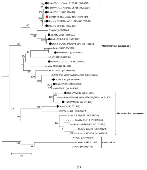 To determine the phylogenetic relationship of BoAstV PE3373/2019/Italy to other members of the Astroviridae family, the sequence was compared with whole genome sequences of representative strains of Mamastrovirus and Avastrovirus genera. The resulting phylogenetic tree (Figure 2a) showed that members of Avastrovirus and Mamastrovirus genera are divided into two different clusters. Within the Mamastrovirus cluster, it was possible to identify two further groups, the genogroup I, containing classical strains, and the genogroup II, including strains associated with a diagnosed encephalitis (Figure 2a, identified with a black dot), as well as BoAstV PE3373/2019/Italy (Figure 2a, identified with a red dot). The previously observed similarities between the strain described in this manuscript and BoAstV CH13/NeuroS1 strains [17] were confirmed by phylogenetic analysis. BoAstV PE3373/2019/Italy clustered together with BoAstV CH13 [16], BoAstV NeuroS1 [15], and BoAstV CH13/NeuroS1 [17] strains, separated from the group, were formed by BoAstV CH15 [19], BoAstV BH89/14 [18], and OvAstV UK/2013/eke/lib01454 [23]. The phylogenetic analysis of the ORF2 gene region (Figure 2b), coding for the capsid protein, resulted in the same genogroup assignment as based on full-length sequences, grouping BoAstV PE3373/2019/Italy together with BoAstV CH13 [16], BoAstV NeuroS1 [15], and BoAstV CH13/NeuroS1 [17] strains within the Mamastrovirus genogroup II.