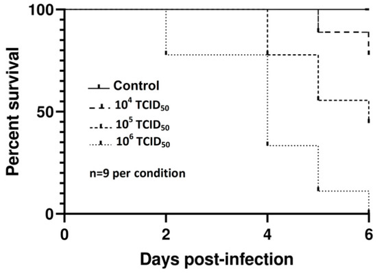 Kaplan–Meier survival curves (Figure 1) showed significant differences in mortalities according to the dose by both the log-rank (Mantel-Cox) (χ2 = 16.9, p = 0.0002) and the Gehan-Breslow Wilcoxon tests (χ2 = 16.03, p = 0.0003) plotted in GraphPad Software. Mock-inoculated embryos remained alive until the end of the experiment.