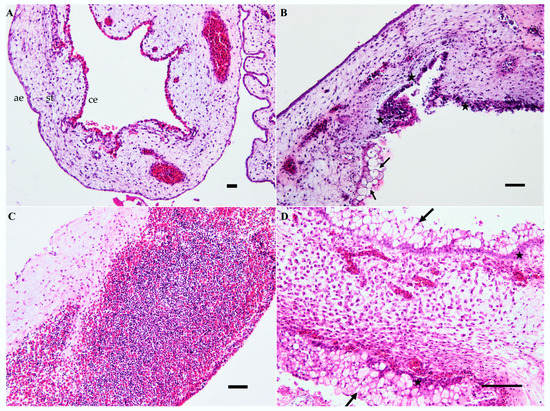 Chorioallantoic membrane from chicken embryos inoculated with the USU-BE-Seraing/2017 strain via the allantoic route. (A) Negative control two days after mock inoculation; (B) diffuse necrosis in the chorionic layer indicated by cell vacuolization (arrows) and massive nuclear fragmentation (stars) at two days post-infection (dpi); (C) massive infiltration of lymphocytes and heterophils in the stroma on day 5 post-infection; (D) Severe degeneration with vacuolization (arrows) and necrosis (stars) of cells in both epithelial layers (5 dpi). Abbreviations: ae, allantoic epithelium; ce, chorionic epithelium; st, stroma. Hematoxylin and eosin stain. Scale bars = 50 µm.
