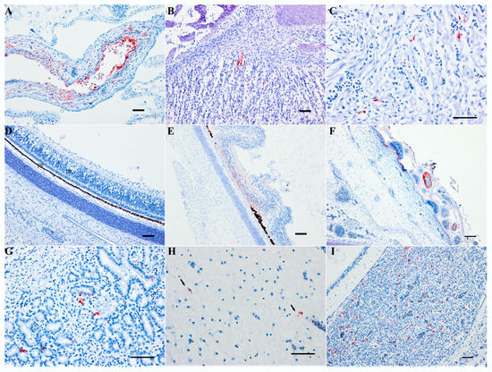 Immunohistochemical staining of Usutu virus antigens and chicken embryos. (A) Chorioallantoic membrane (CAM) on day 3 post-infection (pi); (B) skeletal muscle on day 3 pi; (C) heart on day 5 pi; (D) retina on day 3 of negative control; (E) retina on day 3 pi, degeneration of the neuronal layer with focal loss of the pigmented epithelium; (F) epidermis and feather follicle pulp on day 5 pi; (G) intestine, on day 5 pi; (H) brain on day 5 pi, UR-10-Tm strain; (I) pituitary gland on day 6 pi, USU-BE-Grivegnee/2017 strain. Mayer hematoxylin counterstain. Scale bars = 50 µm.