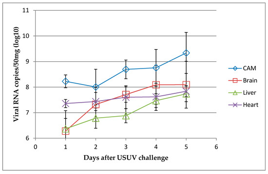 Usutu virus RNA loads detected by RT-qPCR in the brain, heart, liver, and chorioallantoic membrane (CAM) samples of chicken embryos inoculated with USU-BE-Seraing/2017 strain (105 TCID50) via the allantoic route. The data show the mean log 10 viral RNA copies/mL ± standard deviation. n = 5 per tissue per day of infection.