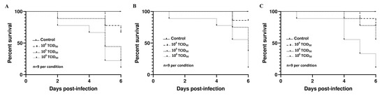 Kaplan–Meier survival curves for chicken embryos inoculated with three different doses of (A) Vienna 2001, (B) UR-10-Tm, and (C) USU-BE-Grivegnee/2017 Usutu virus strains using the allantoic route.
