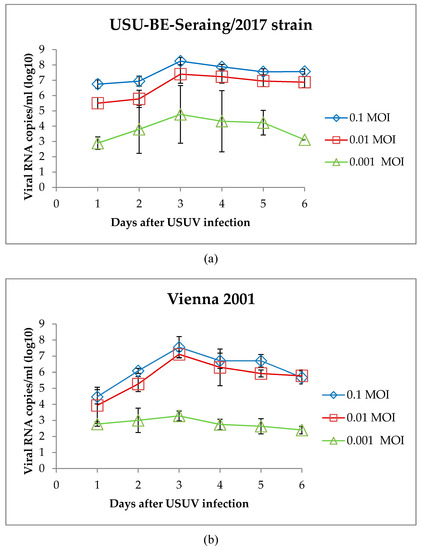 Viral RNA loads in the supernatants of primary cultures of chorioallantoic membrane (CAM) cells infected with different USUV strains (a) USU-BE-Seraing/2017 (b) Vienna 2001, (c) UR-10-Tm, and (d) USU-BE-Grivegnee/2017, as determined by RT-qPCR. CAM cells were infected with USUV at MOIs of 0.1, 0.01, and 0.001. Data are representative of three wells per day for each MOI, each performed in duplicate (error bars represent standard deviations).