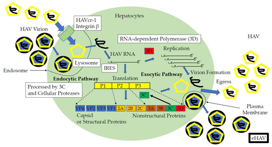 - Rivera-Serrano, E.E.; González-López, O.; Das, A.; Lemon, S.M. Cellular entry and uncoating of naked and quasi-enveloped human hepatoviruses. Elife 2019, 8. [Google Scholar] [CrossRef] [PubMed]