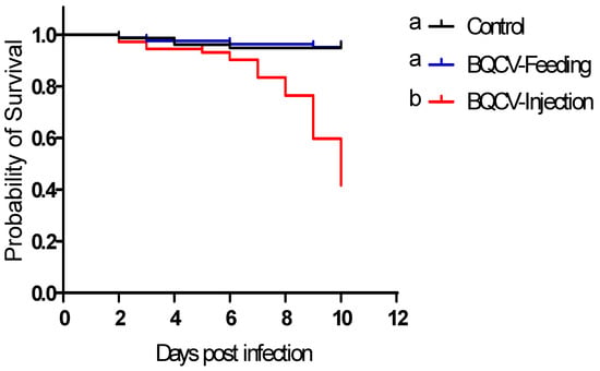 Survival of honey bees treated with Black queen cell virus (BQCV). Bees were either injected with one µL inoculum containing 108 BQCV or fed 10 µL of sugar syrup containing 108 BQCV on day 0. Controls received the same treatments devoid of virus. Different lower case letters indicate statistically significant differences between treatments (Log-rank (Mantel-Cox), p < 0.05).