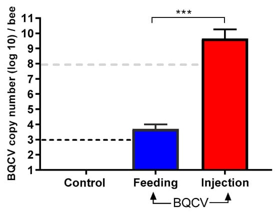 Absolute quantification (mean ± SD) of BQCV per adult honey bee at 10 days post inoculation. Bees (n = 8 bees per treatment) either injected with one µL inoculum containing 108 BQCV or fed 10 µL of sugar syrup containing 108 BQCV. Controls received the same treatments devoid of virus. There was a significant difference in BQCV load (genome equivalents, log10-transformed) between fed and injected bees (Student’s t-test, *** p < 0.001). Black dashed line indicates the threshold of detection while the gray dashed line indicates the initial dose of BQCV.