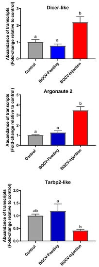 Dicer-like and Argonuate 2 (AGO2) gene transcripts were significantly upregulated in BQCV-injected bees compared to both BQCV-fed bees and to control bees (p < 0.05, Figure 3). The expression of Tarbp2-like was significantly downregulated in BQCV-injected bees compared to BQCV-fed bees (ANOVA p < 0.05). Importantly, differences between bees experimentally infected with BQCV (by feeding or by injection) and controls were not statistically significant (p > 0.05; see Figure 3).