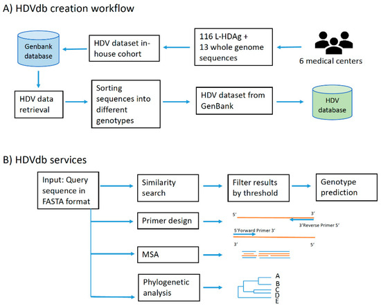 HDVdb construction and analysis workflow. (A) Building blocks of HDVdb based on publicly available and in-house isolates. (B) List of services available at the HDVdb. In Primer design, the orange lines represent template and blue lines represent the primers. In MSA (Multiple sequence alignment): blue and orange lines represent different aligned sequences, schematically.
