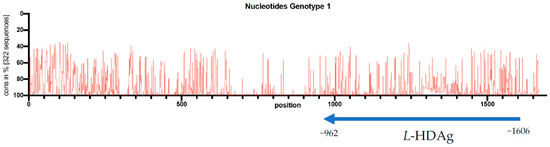 Conservation rate of 322 full genome nucleotide sequences of the HDV genotype 1. The single open reading frame of HDAg is located on antigenomic strand between position 962 and 1606 and indicated with an arrow under the genome.