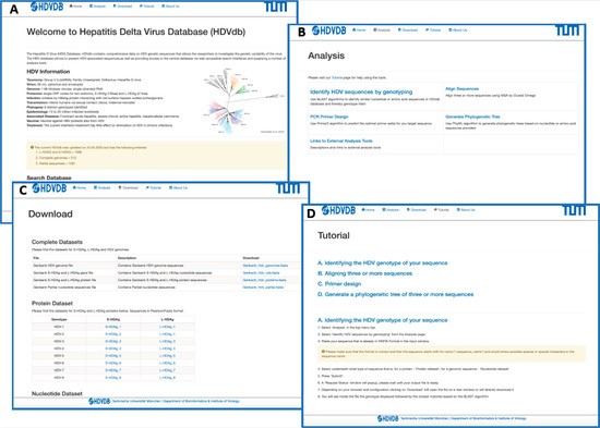 Web interface of the HDVdb. (A) The homepage, with the menu bar and all the menus repeated as buttons for ease-of-use. The page summarizes the characteristics and statistics of HDV. The nucleotide as well as protein datasets can be directly accessed through the homepage. The sequence files can be viewed for each genotype both in protein and nucleotide. (B) List of tools available on the website to analyze HDV related sequences. (C) List of sequence datasets available in FASTA format and updated on a regular basis. (D) A snapshot of the tutorial page with step-by-step instructions on how to use different tools available on this database.