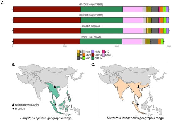 RoBat-CoV GCCDC1 Singapore is genetically similar to the strain detected in China and its host is found in a wide geographic range. (A) The distribution of orthoreovirus p10 gene across three strains of RoBat-CoV GCCDC1—346, 356 and Singapore—as well as a putative parental relative, RoBat-CoV HKU9-1. Note the presence of the p10 gene insertion (dark pink) and accessory gene NS7c (purple) only in the RoBat-CoV GCCDC1 strains. The geographic distribution of (B) E. spelaea and (C) R. leschenaultii across Southeast Asia, respectively [36].