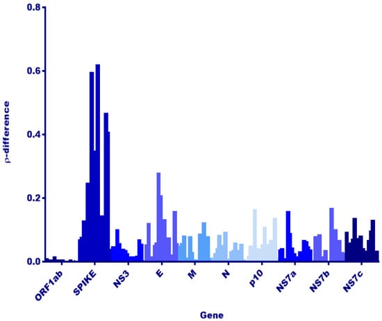 Dinucleotide usage analysis among strains RoBat-CoV GCCDC1 356 and RoBat-CoV GCCDC1 Singapore. Rho-difference values (ρ-difference, y-axis) were calculated, using the results from dinucleotide analysis of each gene (genes shown in shades of blue, x-axis), to evaluate any significant differences among RoBat-CoV GCCDC1 strains detected in different hosts (E. spelaea and R. leschenaultii species). By two-way analysis of variance (ANOVA), the rho-difference for only the spike gene is significantly different from all other genes (alpha 0.05, p < 0.0001), and is a possible indication of differences due to replication within distinct hosts.