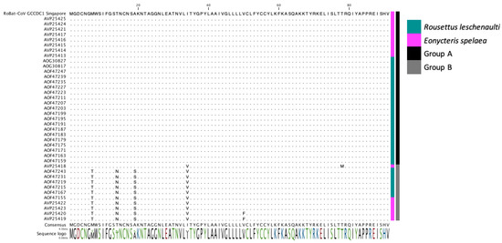 Multiple sequence alignment (MSA) of the amino acid sequence for p10 from RoBat-CoV GCCDC1 of the strain detected in this study, and p10 sequences reported from Yúnnan province, China [25,26,27]. The colored bars to the right of the MSA indicate that the sequence was detected in R. leschenaultii (dark blue) or E. spelaea (pink). Groups A (black) and B (grey) were previously defined in the literature [27].