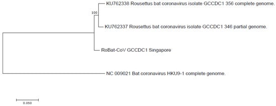 Molecular phylogenetic analysis was performed with 100 bootstrap replicates, using the Maximum Likelihood method based on the General Time Reversible model in MEGA7 [35]. The tree with the highest log likelihood (–74447.85) is shown. The analysis involved four nucleotide sequences: the genome sequence generated from this study (RoBat-CoV GCCDC1 Singapore), GCCDC1 356 (KU762338), GCCDC1 346 (KU762337) and HKU9-1 (NC_009021). All positions containing gaps and missing data were eliminated. There were a total of 28,712 positions in the final dataset.