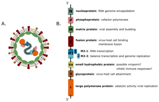 hMPV is an enveloped negative-stranded RNA virus with a non-segmented genome of approximately13.3 kilobases. The viral genome comprises eight genes and codes for nine proteins: nucleoprotein (N), phosphoprotein (P), matrix protein (M), fusion protein (F), matrix-2 proteins (M2-1 and M2-2), small hydrophobic (SH) protein, glycoprotein (G), and large (L) polymerase protein (Figure 1). Together, the N, L, and P proteins form the viral replication complex. Interestingly, the gene order of hMPV is not only different from that of hRSV, but the virus also lacks the non-structural proteins NS1 and NS2 []. Three transmembrane surface glycoproteins are embedded in the lipid envelope: F, G, and SH. The G protein is important for the attachment of the virion to the host cell. The F protein mediates fusion of the viral and host cell membrane. The exact function of the SH protein remains elusive. The F protein sequence is relatively well-conserved between different hMPV genotypes compared to G and SH which are more variable [,,,]. In addition, when grafted into the genome of recombinant replication competent human parainfluenza viruses that were subsequently used to infect hamsters, hMPV F, but not G or SH, was shown to be able to induce neutralizing antibodies [,]. In the ribonucleoprotein complex, the viral RNA is entirely coated by the N protein, resulting in flexible helical nucleocapsids, which are also decorated with the P protein and can recruit the L and M2-1 proteins. In negative-stranded RNA viruses, the viral nucleocapsid serves to protect the viral RNA from degradation and as a template for viral replication and transcription [].