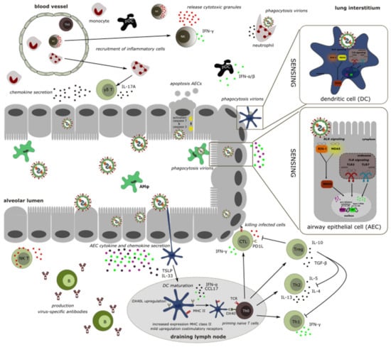 In general, when respiratory viruses break through the mucosal layer that lines the airway epithelial cells (AECs), dendritic cells (DCs) may already come into play, because dendrites of these cells can sample particles that are present in the airway lumen. DCs that take up virions, for example, can process viral proteins into peptides for antigen presentation. Upon DC migration to the regional draining lymph node, the processed viral antigen can be presented to CD4+ and CD8+ T cells. The activated effector T cells with a matching T cell receptor subsequently expand and travel to the lung parenchyma where they can eliminate the infected epithelial cells [].