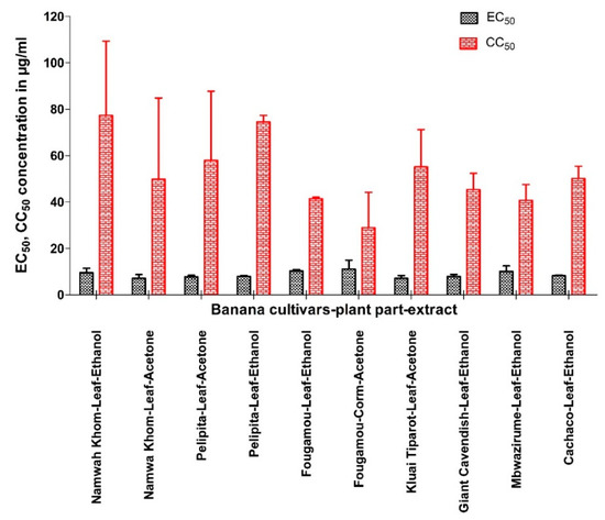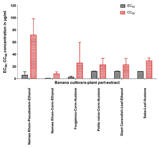 Plantains as well as dessert bananas, and the other parts of the Musa spp. plant, which include roots, corm (i.e., underground stem), pseudostem (i.e., aboveground false stem), leaves, flowers, and peels, have long been used in traditional medicine around the world to treat fevers, burns, liver problems, diarrhea, inflammation, pain, snakebite, and diabetes [9,10,11]. Ethnopharmacological studies have documented several traditional uses of bananas, and different plant parts (flower, leaves, pseudostem, corm, fruit pulp and peels) have been studied for their anti-ulcerogenic [12], hypolipidemic [13], hypoglycemic [14], and wound-healing activity [15]. BanLec, a jacalin-related lectin, was found to be a potent inhibitor of HIV replication [16]. Later, Swanson and coworkers demonstrated that “a single amino-acid substitution in a banana lectin, replacing histidine84 with threonine, significantly reduces its mitogenicity, while preserving its broad-spectrum antiviral potency” [17]. Except for that study, to the best of our knowledge, no scientific study on antiviral properties of Musa has been reported. Therefore, we studied the antiviral (and also cytotoxic) properties of different parts of 10 dessert or cooking banana plants.