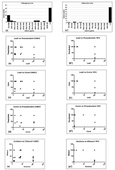 Histogram of EC50 values (a,a’), and correlation of bioactivity against Chikungunya virus (CHIKV) (a–e) or yellow fever virus (YFV) (a’–e’) between different plant parts (b–d,b’–d’) and different solvents (e,e’) used to prepare the extracts.