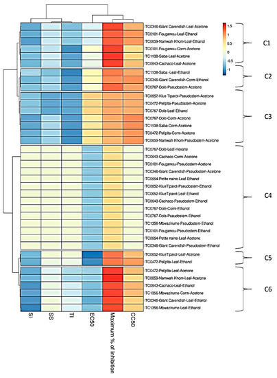 Heat map and clustering of anti-CHIKV activity of extracts from banana cultivars’ plant part. EC50 = 50% Effective Concentration (concentration at which 50% inhibition of virus replication is observed). CC50 = 50% Cytostatic/Cytotoxic Concentration (concentration at which 50% adverse effect is observed on Vero cells in parallel with antiviral assay). SI = Selectivity Index (CC50/EC50). SS = Selectivity Surface (integrated surface delineated by the EC50 curve, the CC50 curve and the 50% horizontal). TI = Therapeutic Index (SS × 10logSI). C1–C6: different clusters.