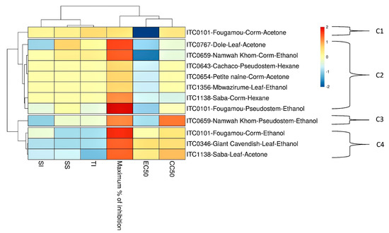 Heat map and clustering of anti-YFV activity of extracts from banana cultivars’ plant part. EC50 = 50% Effective Concentration (concentration at which 50% inhibition of virus replication is observed). EC90 = 90% Effective Concentration (concentration at which 90% inhibition of virus replication is observed). CC50 = 50% Cytostatic/Cytotoxic Concentration (concentration at which 50% adverse effect is observed on Huh cells in parallel with antiviral assay). SI = Selectivity Index (CC50/EC50). SS = Selectivity Surface (integrated surface delineated by the EC50 curve, the CC50 curve and the 50% horizontal). TI = Therapeutic Index (SS × 10logSI). C1–C4: different clusters.