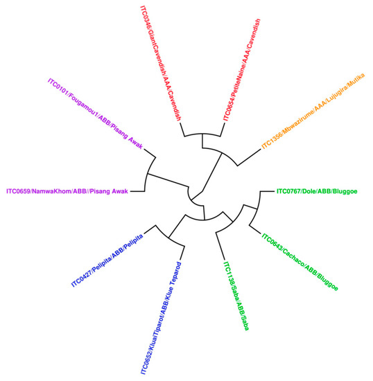 - Christelová, P.; De Langhe, E.; Hřibová, E.; Čížková, J.; Sardos, J.; Hušáková, M.; Van den houwe, I.; Sutanto, A.; Kepler, A.K.; Swennen, R.; et al. Molecular and cytological characterization of the global Musa germplasm collection provides insights into the treasure of banana diversity. Biodivers. Conserv. 2017, 26, 801–824. [Google Scholar] [CrossRef]