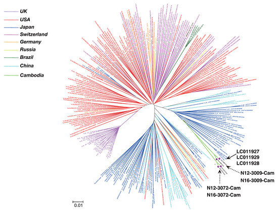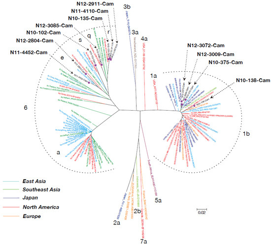 We performed nearly full-length genome sequence analysis on eight cases (Cambodia 1b: four cases, 6e: two cases, and 6r: two cases) (Table 1). Next, we obtained nearly full or full genome sequence of genotype 1b (282 known isolates) from around the world and phylogenetically analyzed four cases (Cambodia isolate: N12-3009-Cam, N16-3009-Cam, N12-3072-Cam, and N16-3072-Cam).
