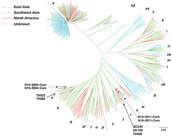 The genotype 6e isolate from our Cambodia study was closely related to strains from Vietnam (TV 503 and TV 280) and the United States (P), with a nucleotide sequence identity of 85.76–92.27%. The genotype 6r isolates (N12-2911-Cam and N16-2911-Cam) from our study were closely related to strains from Asian immigrants living in Canada (QC245 and QC120) and Vietnamese strain TV 406, with a nucleotide sequence identity of 90.13–96.38% (Figure 3).
