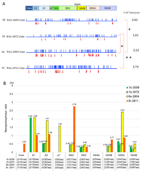 Mutation sites and the rate of nonsynonymous substitution of HCV RNA. (A) Nucleotide and amino acid mutation sites of HCV RNA among four Cambodian subjects. Blue bar indicates nucleotide mutation; red triangles indicate amino acid mutations. A significant difference (*, **) in mutation rate was observed between genotypes 1b (No.3009) and 6e (No.2804) (p < 0.0001); 1b (No.3009) and 6r (No.2911) (p = 0.042); 1b (No.3072) and 6e (No.2804) (p < 0.0001); and 1b (No.3072) and 6r (No.2911) (p = 0.00070). However, there was no significant difference between genotypes 1b (No.3009) and 1b (No.3072) (p = 0.18) or 6e (No.2804) and 6r (No.2911) (p = 0.55). (B) The rate of nonsynonymous substitution in each area of HCV RNA in the same four Cambodian subjects. The numbers of nonsynonymous substitutions per area of HCV RNA are described in each of 10 areas.