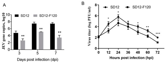 Three-week-old weanling female C57BL/6 mice (10 mice/group) were inoculated intracerebrally with either SD12 or SD12-F120 at a dose of 103 PFU (30 μL/each). Brain tissues were collected at 3, 5, and 7 dpi, and JEV replication was detected by a quantitative real-time reverse transcription-polymerase chain reaction (qRT-PCR) with primer pair and probe (Supplementary Table S2) for amplification of JEV PrM gene as described previously [33].