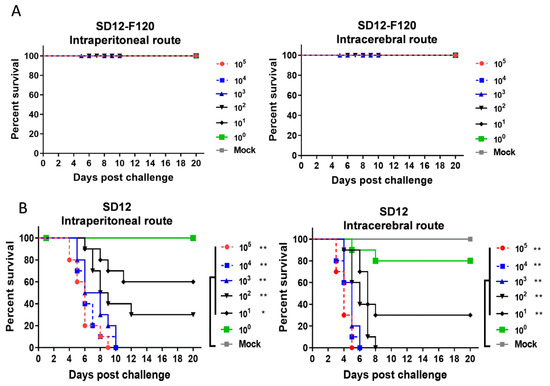 Neuroinvasiveness and neurovirulence tests in mice. Mice (10 mice/group) were inoculated intraperitoneally or intracerebrally with either SD12-F120 (A) or SD12 (B) at doses ranging from 100 to 106 PFU to measure neuroinvasiveness or neurovirulence, respectively. The mice were monitored daily for 20 days. Kaplan–Meier test was used for survival analysis. Asterisks indicate values that are statistically significant (* p < 0.05; ** p < 0.01).