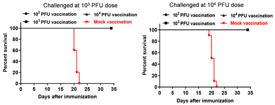 To determine whether the attenuated SD12-F120 could be used as a vaccine candidate strain, we examined the protective efficacy of SD12-F120 using a mouse challenge model [19]. Mice were immunized with SD12-F120 at doses ranging from 102 to 104 PFU and challenged after 14 days with SD12 at a dose of 103 and 104 PFU, respectively. All mock-vaccinated mice developed the clinical signs of JEV infection following the SD12 challenge and were sacrificed (Figure 4). In contrast, the mice vaccinated with SD12-F120 at doses ranging from 102 to 104 PFU survived without visible clinical signs, showing that attenuated SD12-F120 strain provided the vaccinated mice complete protection from the lethal dose challenge of its virulent parental SD12 strain.