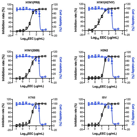 Seasonal influenza is an acute respiratory infection caused by influenza viruses that circulate the world [27]. Influenza A and B viruses cause seasonal epidemics of disease. Currently circulating in humans are subtype A(H1N1) and A(H3N2) influenza viruses [28]. Influenza viruses circulating in animals, e.g., birds, pose threats to human health in that they can develop the ability to infect humans and cause illness [29]. In patients with influenza pneumonia, multiple cell types, including epithelial cells, alveolar cells, and monocytes, are infected by the influenza virus and contribute to direct cytopathogenic and inflammatory damage to the lung [30,31]. In our in vitro study, in addition to the commonly used MDCK cells, we tested the antiviral effect of EEC against a panel of influenza viruses on the epithelial A549 cells and monocytic U937 cells. However, the efficacy of EEC is not as good as oseltamivir (data not shown), but comparable to that of ribavirin (Figure S1).