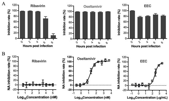 To determine the stage of the influenza virus life cycle inhibited by EEC, a time-of-addition assay was conducted. MDCK cells were infected with 0.1 MOI of influenza virus at 4 °C for 1 h, followed by cell culture at 37 °C for 12 h. During the cell culture, three EC50 of ribavirin, oseltamivir, and EEC were added respectively at different time points and maintained for 12 h. The supernatants were collected, and the virus yields were determined by the NA activity assay. As shown in Figure 3A, similar to oseltamivir, EEC inhibited the virus replication completely when added at all time points until 8 hpi, indicating that EEC may inhibit the very late stage of the influenza virus life cycle, which includes mainly the release of virions that is related to the function of virus neuraminidase. To determine whether EEC inhibits the virus neuraminidase activity, an in vitro neuraminidase inhibition assay was conducted. As shown in Figure 3B, similar to oseltamivir, EEC inhibited the neuraminidase activity concentration-dependently. Taken together, our results show that EEC inhibits the late stage of the influenza virus life cycle. Since the virus neuraminidase activity is required for the release of virions, we speculate that EEC may inhibit the release of influenza viruses.