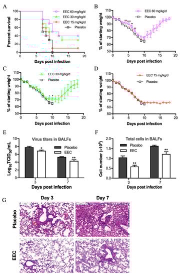 When mice are infected with the influenza virus, a large number of inflammatory cells are often infiltrated in the lung tissue, accompanied by enhanced inflammatory injuries in the lung [25,26]. To examine the total cell infiltration and pathological changes in the lungs of mice infected by lethal influenza and treated or untreated with EEC, the total cell counting in the BALFs and H&E staining of the lung tissue of mice were conducted. As shown in Figure 4F, the total number of cells at day 3 and 7 in BALFs of mice treated with 60 mg/kg/d of EEC decreased by 40% and 25%, respectively. A further pathological examination by H&E staining revealed that the pathogenic damage in the lungs treated with EEC improved significantly at day 3 and 7 post-infection (Figure 4G). We speculate that the reduction in infiltrated cells and pathological damage in the lung may be a result of the decrease in virus titer mediated by the antiviral effect of EEC.