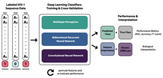 Briefly, our deep learning approach included training and cross-validation of three architectures for binary classification of labeled HIV-1 sequence data: MLP, BRNN, and CNN (Figure 1). In addition to comparing performance metrics across architectures, we evaluated feature importance using a permutation-based method and interpreted these results using known DRM loci. Lastly, we reconstructed and annotated phylogenetic trees from the same data in order to assess clustering patterns of resistant sequences.