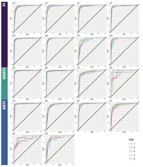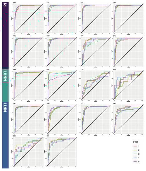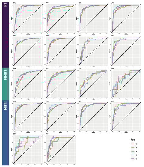 Receiving operator characteristic (ROC) curves for the Multilayer Perceptron classifier. Horizontal axes are specificity; vertical axes are sensitivity. The five curves represent the results of each cross-validation step. Curves which are closer to a ninety-degree angle in the top left corner represent better performance. Area under the curves is given in Table A4. Abbreviations: FPV = fosamprenavir; ATV = atazanavir; IDV = indinavir; LPV = lopinavir; NFV = nelfinavir; SQV = saquinavir; TPV = tipranavir; DRV = darunavir; 3TC = lamivudine; ABC = abacavir; AZT = azidothymidine; D4T = stavudine; DDI = didanosine; TDF = tenofovir disoproxil fumarate; EFV = efavirenz; NVP = nevirapine; ETR = etravirine; RPV = rilpivirine; PI = protease inhibitor; NRTI = nucleotide reverse transcriptase inhibitor; NNRTI = non-nucleotide reverse transcriptase inhibitor.