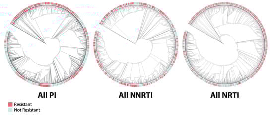 Our initial, null hypothesis was that resistant and non-resistant sequences would cluster among themselves due to similarities at DRM loci. However, the AU test rejected all constrained trees with high confidence, indicating that resistant and non-resistant sequences do not entirely separate in any of the phylogenies. While some trends in the clustering of drug resistant sequences in the phylogenies are visibly apparent, low bootstrap support values precluded statistical analysis of clustering in the context of model performance. Low bootstrap support values are known to be typical in HIV-1 phylogenies due to high similarity among sequences and potential recombination events []. This observation demonstrates that phylogenetics alone is not sufficient to determine drug resistance status, further necessitating the development and use of computational tools designed for drug resistance prediction for clinical and public health applications.