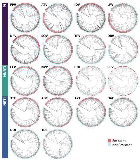 Annotated phylogenetic trees for each dataset. Resistant sequences are denoted by red labels; non-resistant sequences are denoted by blue labels. Abbreviations: FPV = fosamprenavir; ATV = atazanavir; IDV = indinavir; LPV = lopinavir; NFV = nelfinavir; SQV = saquinavir; TPV = tipranavir; DRV = darunavir; 3TC = lamivudine; ABC = abacavir; AZT = azidothymidine; D4T = stavudine; DDI = didanosine; TDF = tenofovir disoproxil fumarate; EFV = efavirenz; NVP = nevirapine; ETR = etravirine; RPV = rilpivirine; PI = protease inhibitor; NRTI = nucleotide reverse transcriptase inhibitor; NNRTI = non-nucleotide reverse transcriptase inhibitor.