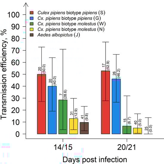 Transmission efficiencies for Cx. pipiens biotype pipiens, Cx. pipiens biotype molestus, and Ae. albopictus 14/15 and 20/21 days post infection at an incubation temperature of 25 °C. Error bars represent 95% confidence intervals. The number above each bar indicates the number of mosquitoes tested per species/time point, and in brackets, the percentage tested WNV-positive.