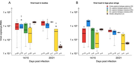 Viral load in mosquito bodies (A) and legs plus wings (B) 14/15 and 20/21 days post infection in the different strains: Culex pipiens biotype pipiens, Cx. pipiens biotype molestus, and Aedes albopictus. The horizontal black lines represent the medians, the black ×’s the means, the boxes show the interquartile ranges, and the whiskers the minimum and maximum values. Data falling outside the interquartile ranges are plotted as outliers (o). The number of samples tested per species/time point are indicated above the x-axis.
