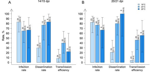 Infection rate, dissemination rate, and transmission efficiency of field-collected Culex pipiens biotype pipiens from “Groß Kreutz”, Brandenburg, Germany, (A) 14/15 and (B) 20/21 days post infection (dpi) at three different temperature regimes. Error bars represent 95% confidence intervals. The number above each bar indicates the number of mosquitoes tested per species/time point, and in brackets, the percentage tested WNV-positive.