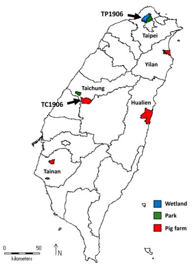 Map showing mosquito collection sites in Taiwan. Mosquitoes collected from wetland, parks and pig farms are indicated with blue, green and red colors, respectively. Black arrows indicate collection sites of mosquitoes infected with novel TMUV strains TP1906 and TC1906.